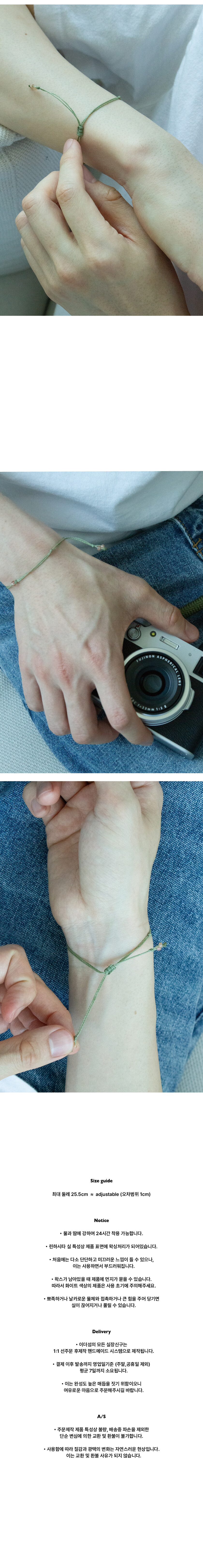 본 제품은 얇은 실의 특성과 컬러감을 가장 잘 느낄 수 있는 실장신구입니다. 매듭으로 길이조절을 하여 착용하는 방식으로. 팔목의 두께에 상관없이 편히 활용할 수 있습니다.