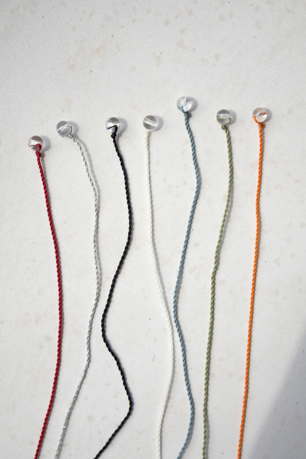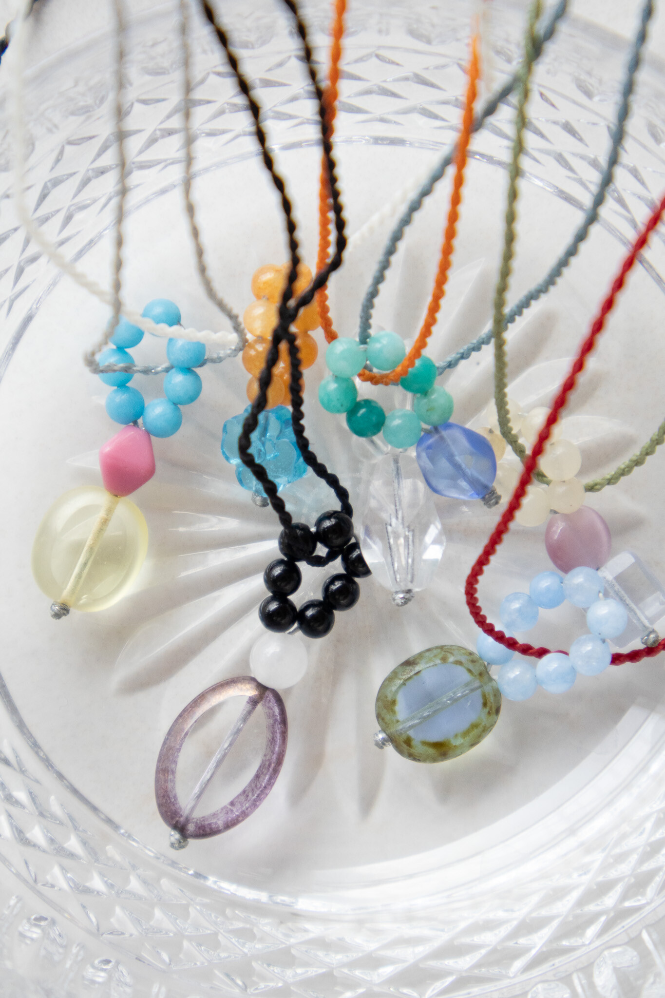 매듭으로 길이조절을 하여 착용하는 방식으로, 초커 기장과 드롭형식으로도 착용 가능한 목걸이입니다. 목걸이줄의 한쪽 끝에는 구형 수정원석이 달려 있어서 더욱 입체적인 연출이 가능합니다. 무드에 따라 취향에 맞는 길이로 연출해보세요.