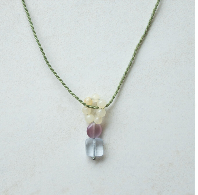 둥근 천연 원석를 연결한 고리와 체코 유리비즈를 반짝이는 얇은 실버 실로 꿰어 마감한 펜던트 입니다. 취향에 맞는 목걸이줄의 색을 고르시면 정성껏 실을 꼬아서 펜던트와 이어드립니다.