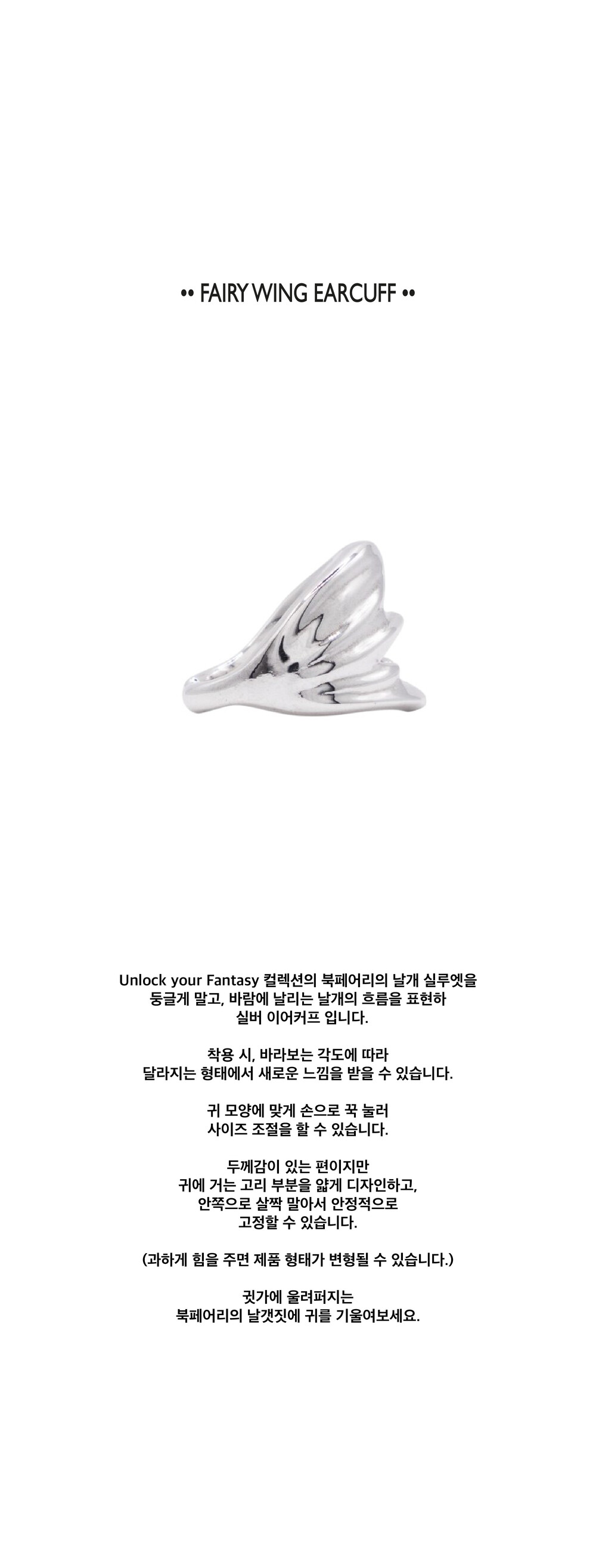 Unlock your Fantasy 컬렉션의 북페어리의 날개 실루엣을 둥글게 말고, 바람에 날리는 날개의 흐름을 표현하 실버 이어커프 입니다.