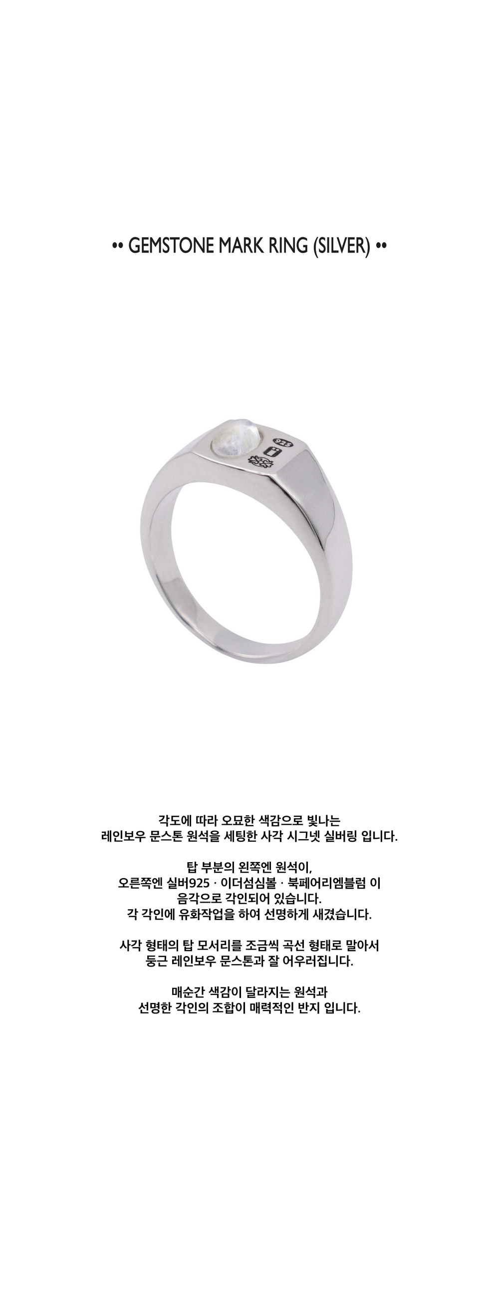 각도에 따라 오묘한 색감으로 빛나는 레인보우 문스톤 원석을 세팅한 사각 시그넷 실버링 입니다.