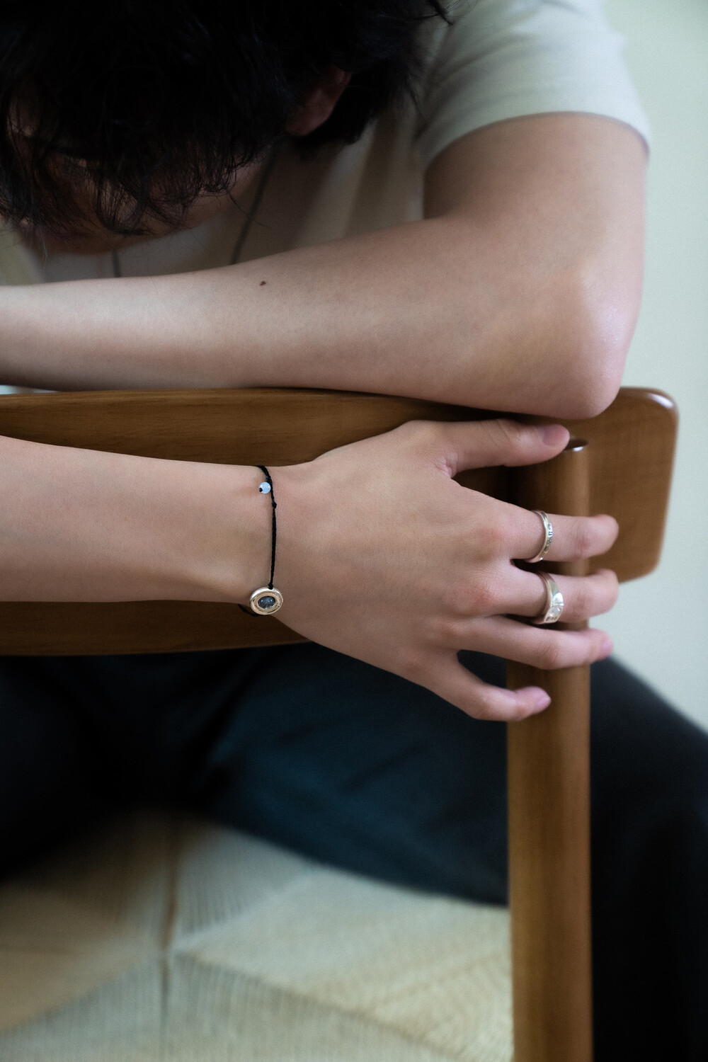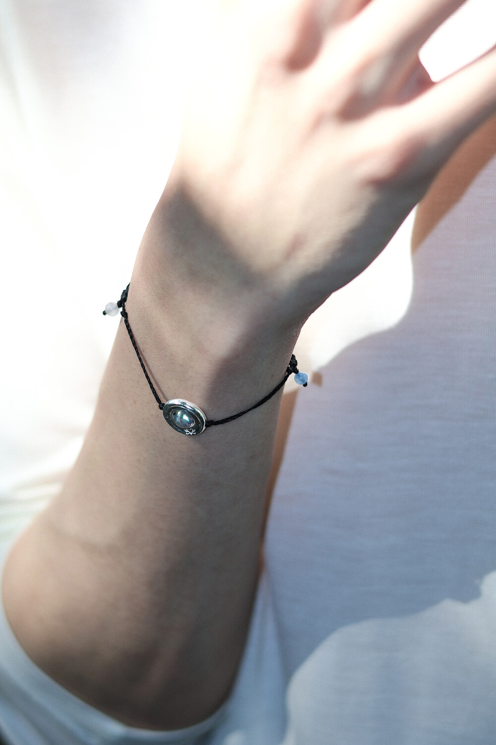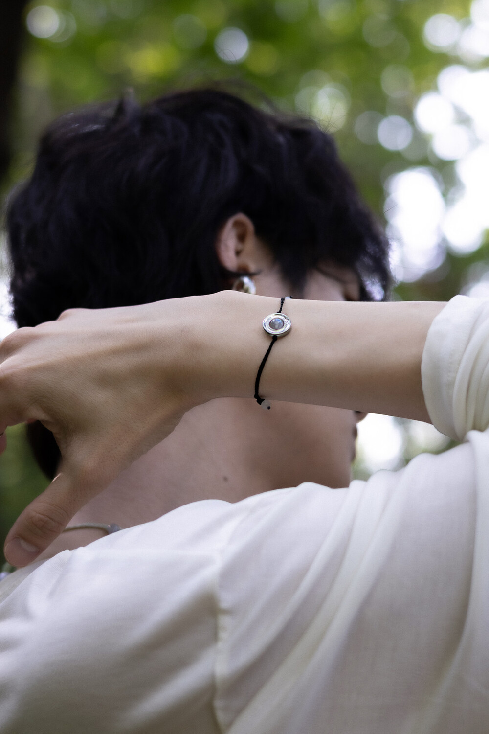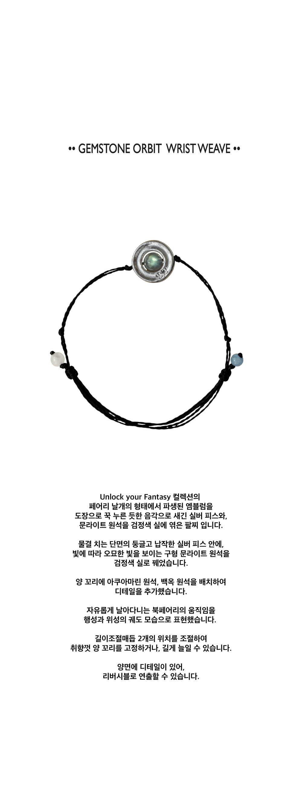 Unlock your Fantasy 컬렉션의 북페어리 날개의 형태에서 파생된 엠블럼을 도장으로 꾹 누른 듯한 음각으로 새긴 실버 피스와, 문라이트 원석을 검정색 실에 엮은 팔찌 입니다.
