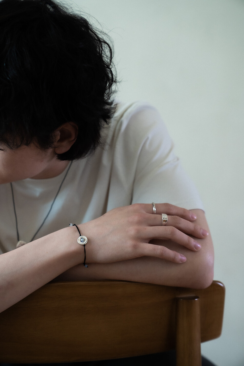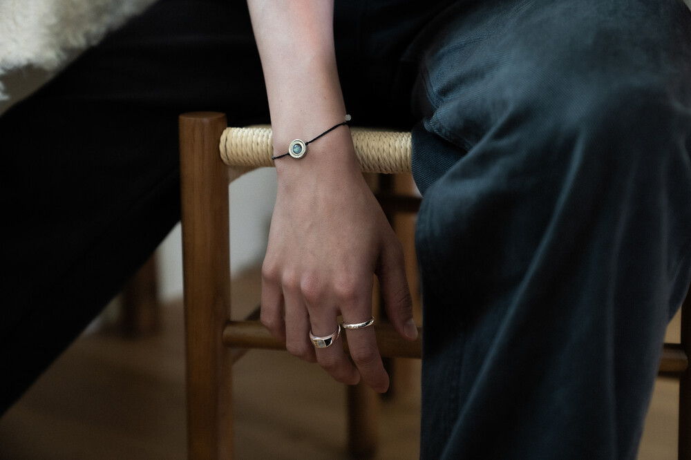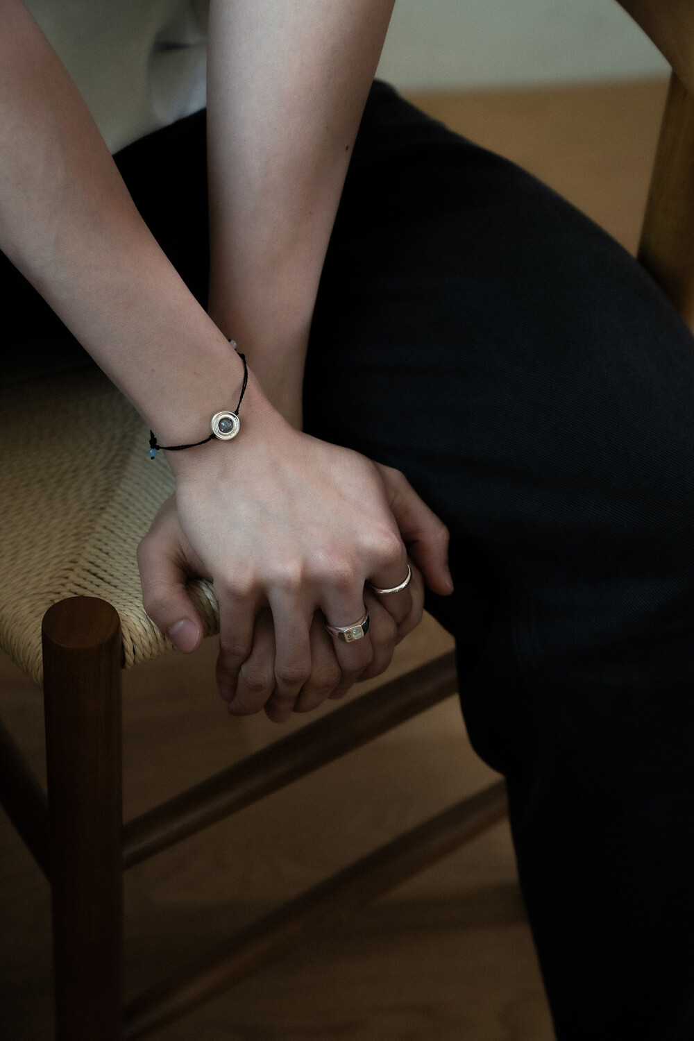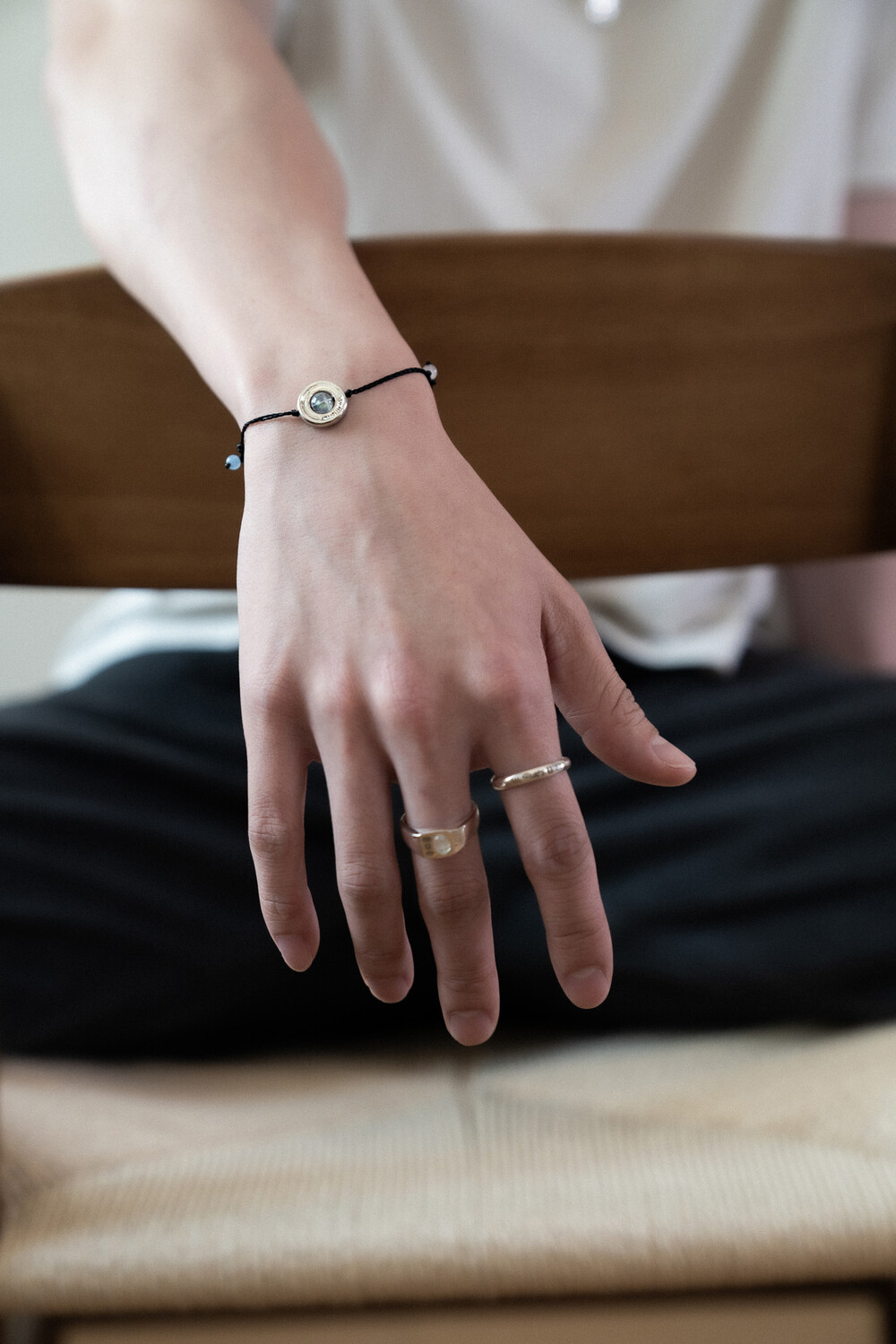 Unlock your Fantasy 컬렉션의 북페어리 날개의 형태에서 파생된 엠블럼을 도장으로 꾹 누른 듯한 음각으로 새긴 실버 피스와, 문라이트 원석을 검정색 실에 엮은 팔찌 입니다.