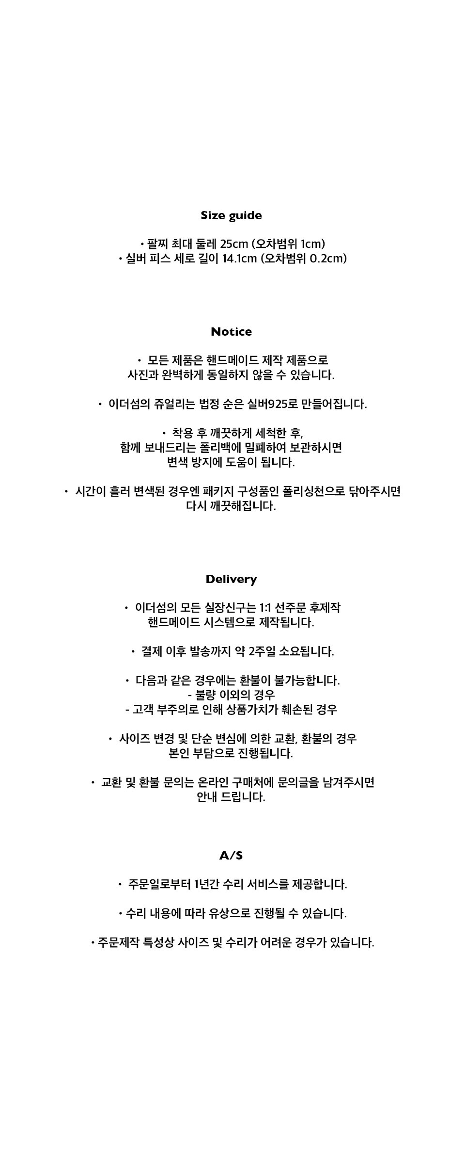 물결 치는 단면의 둥글고 납작한 실버 피스 안에, 빛에 따라 오묘한 빛을 보이는 구형 문라이트 원석을 검정색 실로 꿰었습니다.